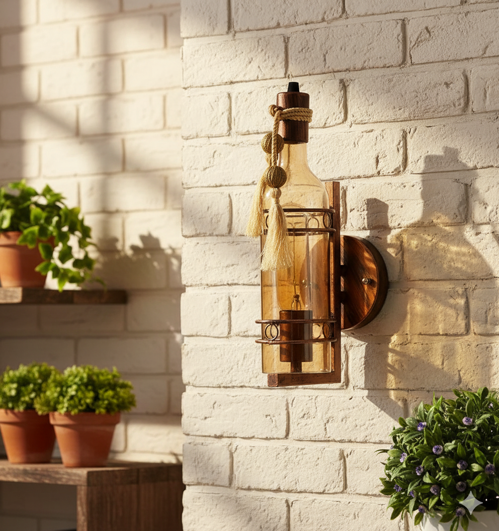 This Bottle-Shaped Wall Lamp is a beautifully crafted decorative light designed to bring a warm, rustic charm to your interiors. Featuring a unique bottle-inspired silhouette and a rich brown finish, this wall hanging light serves as both an attractive décor piece and a functional lighting source.