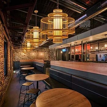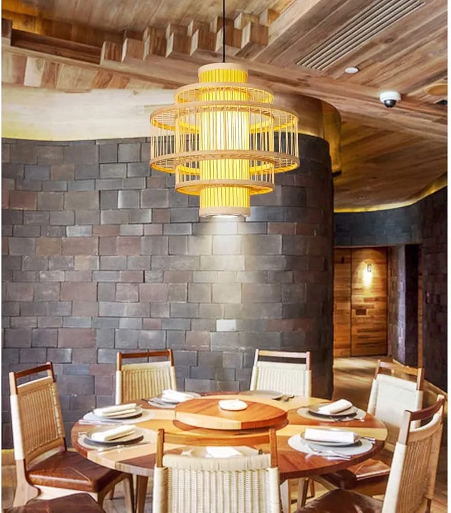 Its open wicker structure diffuses light beautifully, creating a warm and inviting atmosphere — perfect for restaurants, cafés, hot pot eateries, lounges, villas, and grand living spaces. The natural golden tones of bamboo add a touch of sophistication while maintaining an organic, earthy charm.