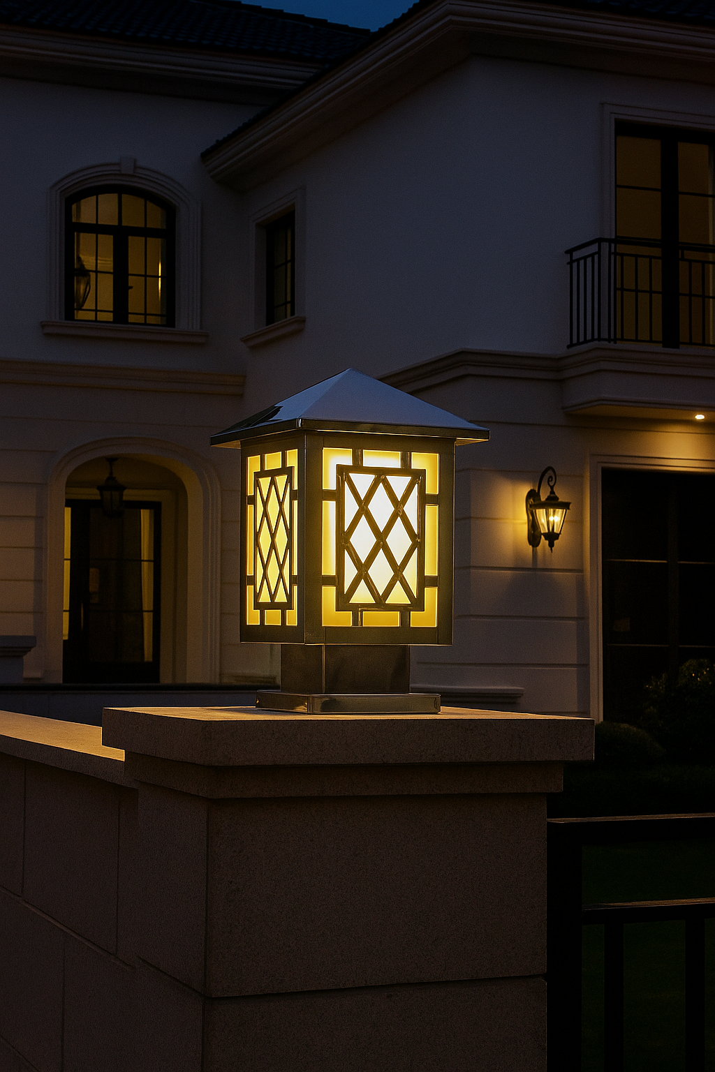 Crafted with meticulous attention to detail, this lamp features a high-grade stainless steel body that resists rust, corrosion, and fading, even in extreme weather conditions. The lattice-cut design on all sides allows light to filter beautifully through the frosted glass panels, creating a warm, diffused illumination that enhances evening ambiance without glare.
